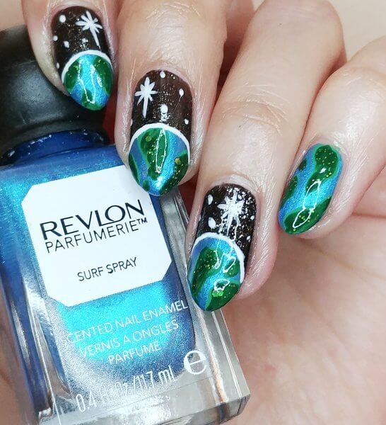 Next for my planet Earth touch. As you can see I opted for a reverse way french mani kinda vibe & created the top spherical curve of the planet on to the tips only except for my pinkie finger which I've covered completely.